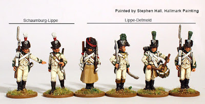 Mittlerweile gibt es auch Truppen von Lippe, modelliert von den Perry Zwillingen, allerdings nur in Marschhaltung. Diese aber wiederum einmal mit korsischem Hut, aber auch mit Tschako, der ja in Spanien getragen wurde, wie wir den Memoiren Barkhausens entnehmen konnten.