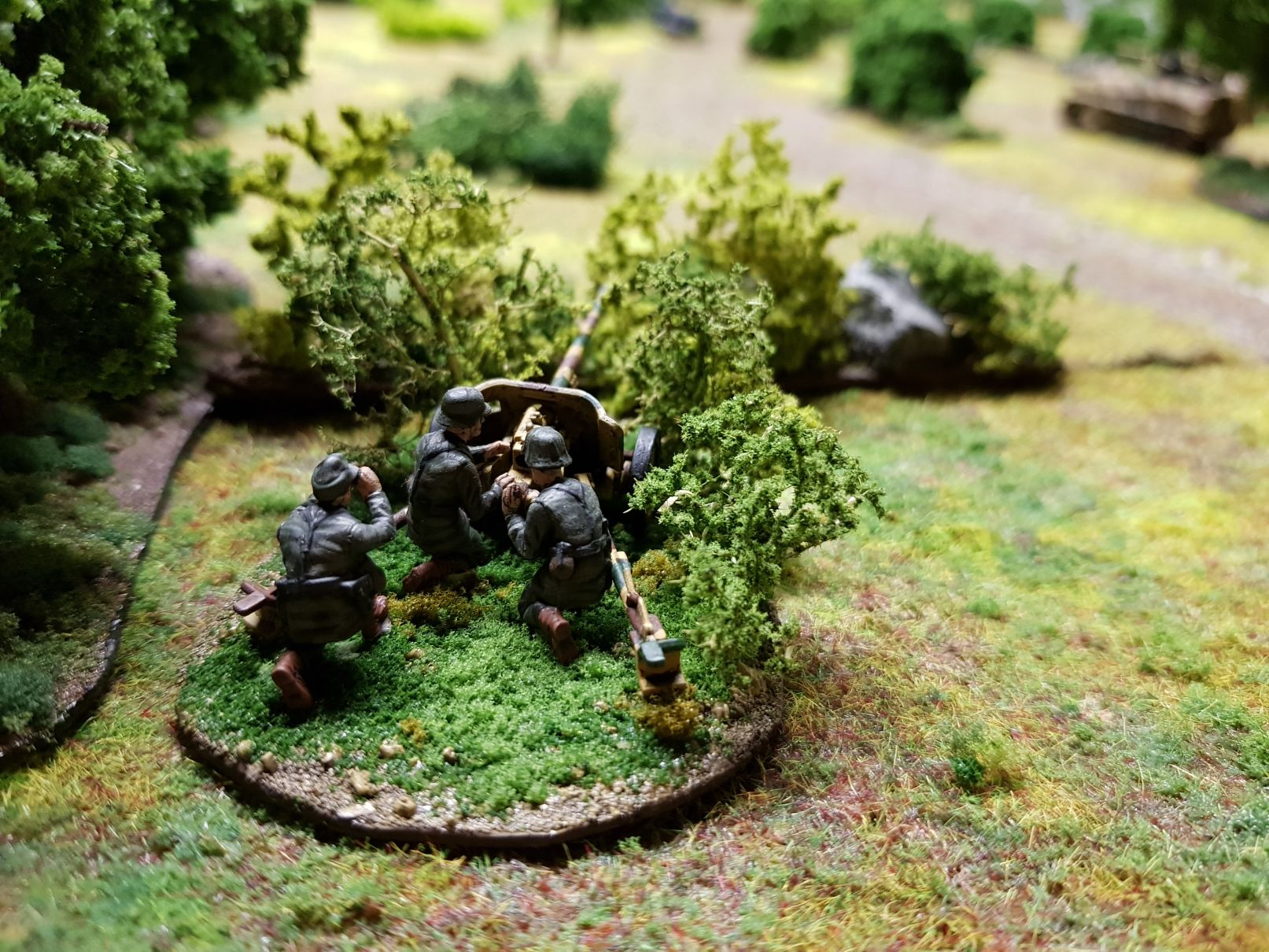 Sven had distributed his beautifully designed markers and terrain pieces everywhere, and the special highlight this time was the just finished PAK, which, well camouflaged, was supposed to threaten the path of my tanks.