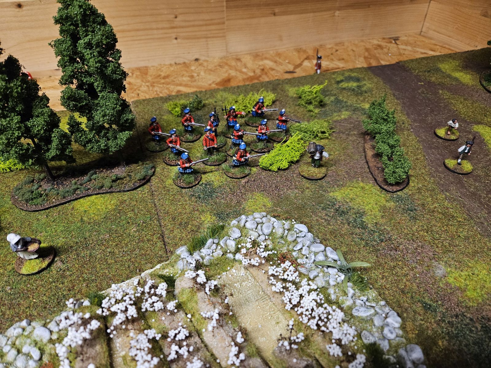 Jean de Frontenac hatte seine Kompanie am rechten Flügel hinter einen großen Leitwagen in Deckung geführt, und lenkte von hier das Feuergefecht seiner Plänkler. Die Treffer waren äußerst wirksam. Nach zwei Runden heftigem Feuer mit entsprechenden Verlusten und nachdem die Highlander dann auch noch den Moraltest nicht mehr schafften, platzte die Einheit.